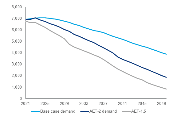 Whilst the commitment to “phase down” coal is somewhat nebulous it is worth outlining what different temperature pathways would mean for thermal coal demand. Under our base case Energy Transition Outlook (ETO), which is aligned to a 2.7 °C warming TO scenario, demand for thermal coal will peak in 2025 at just over 7 billion tonnes, falling by just 5% to 6.7 billion tonnes in 2030, hardly a transformation!. However, to achieve our AET-2, 2 °C pathway, demand for thermal coal will need to fall by a billion tonnes by 2030 and an AET-1.5 pathway removes a further 1.9bn tonnes of demand. This is a dramatic 2.4bn tonne reduction compared with the current base case peak in 2025. With COP26 renewing aspirations to align with Paris commitments to limit the average global temperature rise to 1.5°C the scale of the challenge of such a dramatic reduction of coal demand should not be underestimated given the implications for electricity supply in an increasingly electrified world.