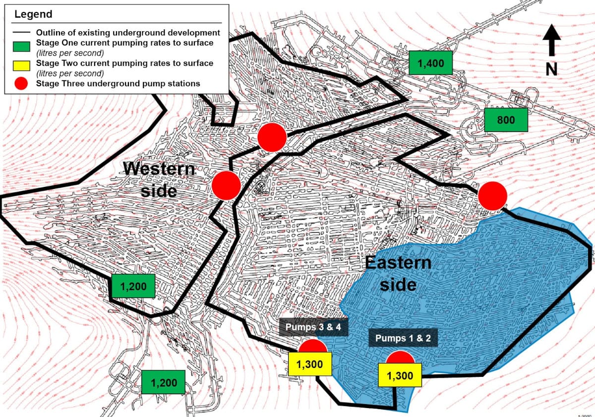 Stage Three dewatering activities will take over from Stage Two dewatering, and consist of re-commissioning the existing, water-damaged underground horizontal pump stations, which are used for steady-state operations. The rehabilitation work consists of fitting new pump motors, substations and electrical cabling. All required equipment is on site, and installation will begin once access to the horizontal pump stations becomes available.