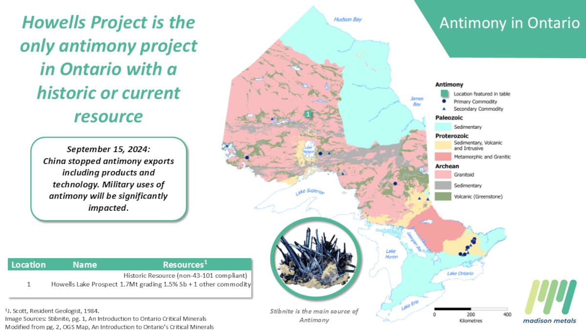 Madison Metals acquires one of Canada’s largest undeveloped antimony deposits in a Hemlo Gold Camp setting