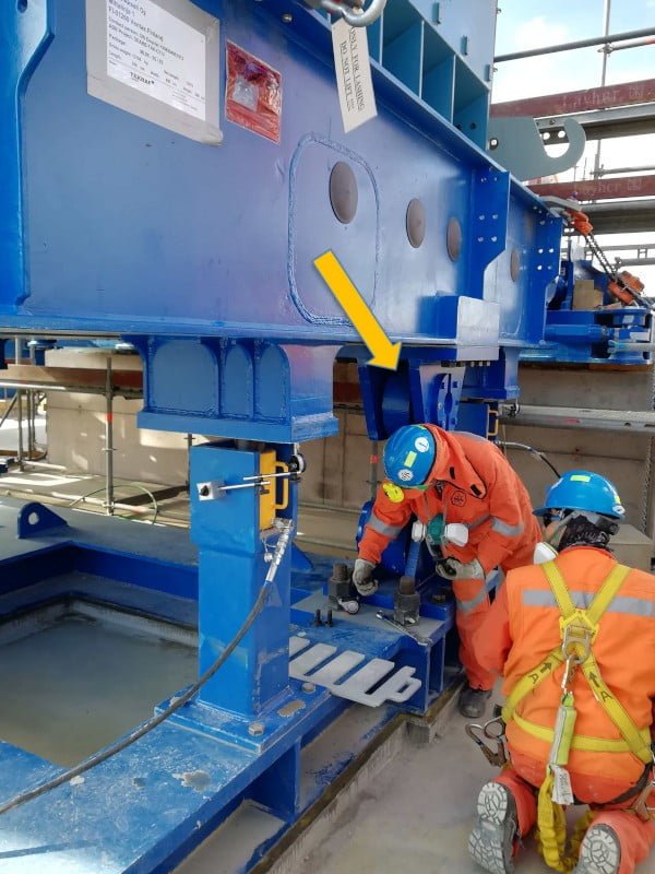 Maintenance of the air gap between the rotor and stator is a crucial requirement for the operation of the motors. The air gap, which is 14 mm, must only be allowed to deviate from the setpoint within small tolerances. Deviations in the air gap reduce the efficiency of the motor, and if rotor and stator were to make contact with each other, this would result in damage to the motor. The air gap itself is continuously monitored during operation. If deformations and/or subsidence in the steel structure or in the motor foundations lead to a deviation in the air gap setpoint, the stator has to be realigned. To simplify this process, the spacing between the rotor and stator at the non-driven end of the motor was fixed by a support bearing.
